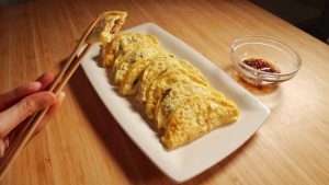 Biasanya pancake ini disajikan dengan tomat rebus, hidangan sederhana yang memberi warna pada meja. Tomat diolah tanpa banyak bumbu, hanya direbus hingga kulitnya pecah dan dagingnya lembut, lalu diberi sedikit garam dan gula. Rasanya asam-manis, segar, sekaligus menenangkan. Dalam filosofi Tionghoa, tomat melambangkan he, keharmonisan. Ia tidak menonjol, tapi kehadirannya menyatukan rasa lain. Saat tomat menemani pancake isi telur, ada keselarasan: lembut dan asam, padat dan cair, hangat dan sejuk.