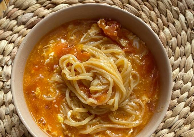 Tahap berikutnya adalah membuat kuah telur tomat yang memberikan keseimbangan rasa segar dan lembut. Bawang putih kembali ditumis hingga harum, kemudian tomat segar yang telah dihancurkan dimasukkan dan dimasak hingga lembek serta mengeluarkan sari. Setelah itu, air ditambahkan dan dibiarkan mendidih sebelum telur kocok dituangkan perlahan sambil diaduk agar membentuk serat halus. Larutan maizena ditambahkan untuk memberikan sedikit kekentalan pada kuah, kemudian dibumbui dengan garam dan merica sesuai selera. Kuah ini menjadi pelengkap yang sempurna bagi mie berbumbu minyak, karena rasa asam segar tomat berpadu dengan gurihnya bawang putih.