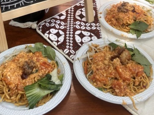 Sementara itu, mie direbus hingga matang dan ditiriskan. Mie panas dicampur dengan minyak dasar yang telah dibuat, diaduk hingga seluruh helainya terlapisi bumbu. Setelah itu, kuah tomat telur panas disiramkan di atasnya.