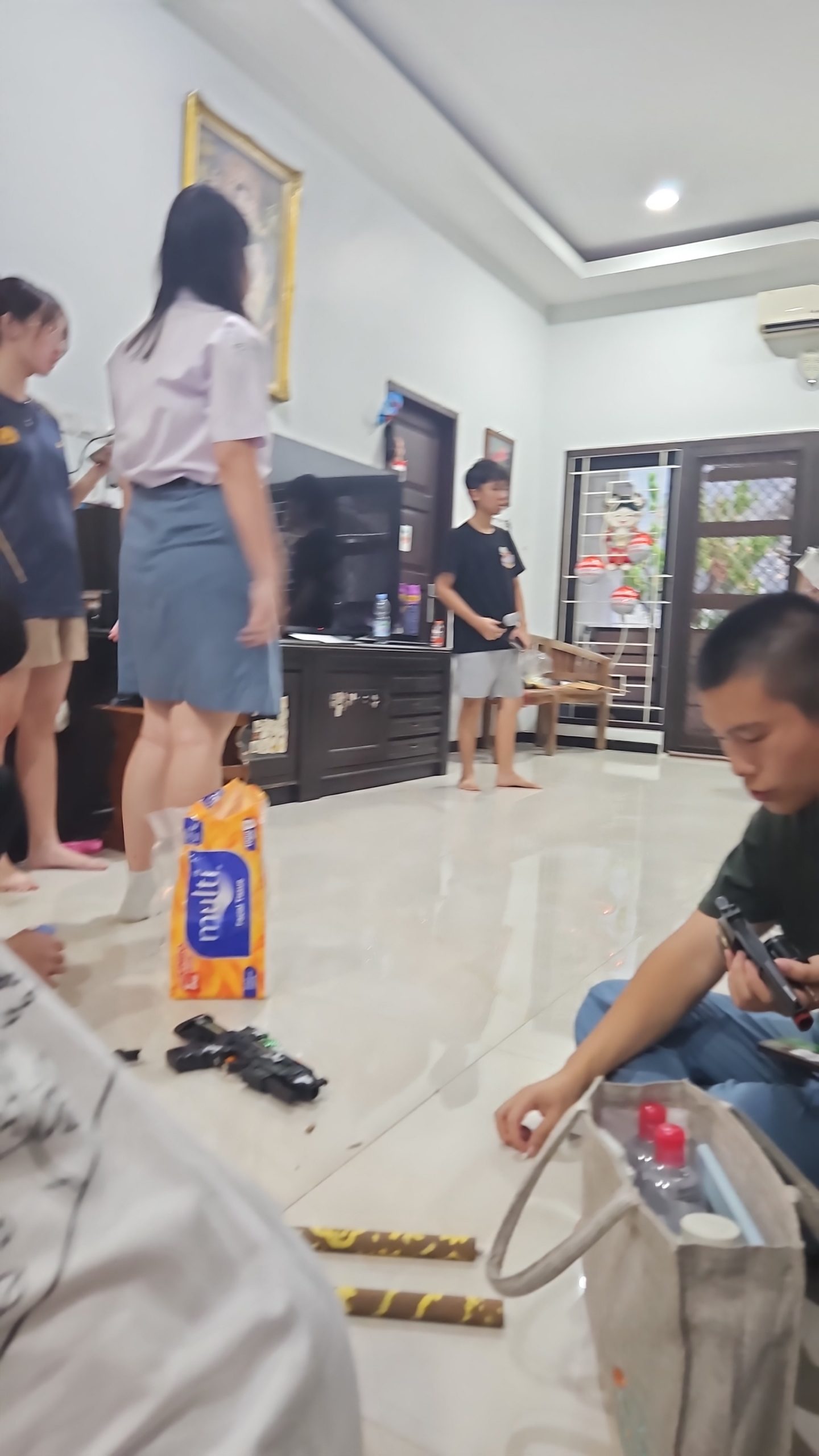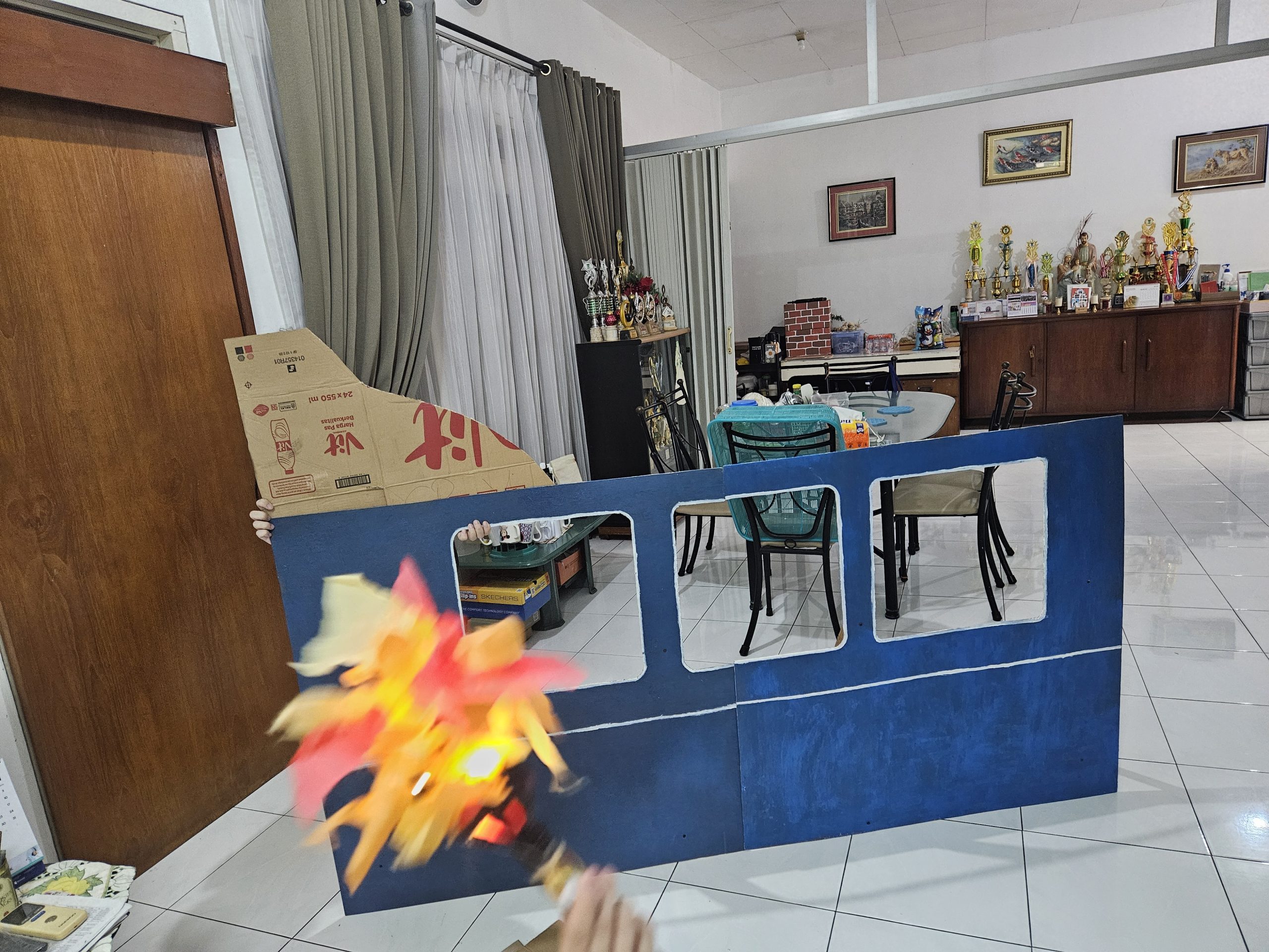 Kami kembali kerja kelompok di rumah Petri mulai dari pulang sekolah latihan UTBK hingga sore sekitar pukul 6 sore. Hari ini tim properti melanjutkan pengerjaan campfire dengan menambahkan api dari kertas kreb yang dipotong segitiga lalu ditempelkan pada base campfire yang telah dibuat. Ditambahkan juga lampu hias di campfire untuk memberikan efek nyala api. Kami juga membuat properti telepon jadul dan mesin komunikasi. Semua properti hampir dibuat menggunakan kardus. Telepon dibuat dengan menggunakan kardus, tongkat kayu dan botol plastik sebagai gagang. Sementara itu mesin komunikasi dibuat dengan menggunakan kardus sepenuhnya yang dicat hitam. Saya turut membantu dalam pengerjaan properti-properti tersebut. Saya menyadari bahwa saya mengalami kesulitan dalam bagian pengecatan sehingga saya lebih banyak membantu dalam pemotongan kardus yang digunakan. Sembari pengerjaan properti, kami juga latihan untuk pembacaan naskah bersama. Saya mendapat peran sebagai kepala suku 1 dan latihan intonasi dan pelafalan yang sesuai.