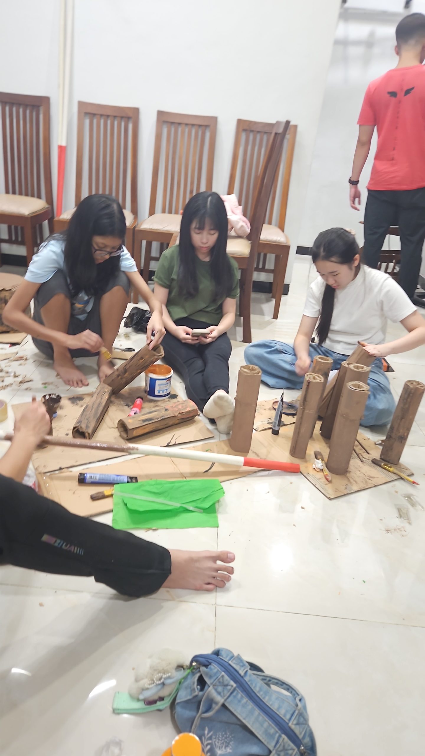 Kerja kelompok berlangsung mulai pulang sekolah hingga sekitar jam 6 sore. Kami melanjutkan pengerjaan properti campfire, kursi kayu, dan lainnya. Kursi kayu dibuat dengan menggunakan kursi plastik kecil yang digulung dengan bagian dalam kardus kemudian di cat menyerupai potongan batang pohon, proses ini menggunakan cukup banyak lem agar kuat, saya turut membantu menyiapkan kardus gulungan yang dipakai dan pengeleman. Untuk properti campfire dibuat dengan menggunakan kardus yang digulung menyerupai kayu bakar kemudian disusun menyerupai campfire, proses ini memakan waktu cukup lama karena memerlukan cukup banyak gulungan kardus kemudian proses pengecatan. Saya pun turut bekerja sama dengan teman-teman untuk membuat gulungan kardus serta penyusunannya. Proses pembuatan campfire belum selesai pada hari itu menyisakan pembuatan api dari kertas kreb serta lampu hias. Saya menyadari diperlukan kerja sama dari anggota kelas untuk dapat menyelesaikan suatu properti dengan inisiatif dari diri sendiri tanpa menunggu arahan. Dengan kerja sama yang terjalin, pengerjaan properti benar-benar terasa menjadi lebih cepat selesai.