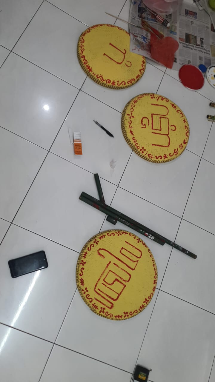 Hari itu kami kembali kerja kelompok untuk pengerjaan properti tampah dan mulai membuat senjata para tentara. Tampah untuk para penari dicat berwarna kuning kemudian dituliskan aksara Jawa “Tjilik Riwut”. Kemudian kami mulai membuat senjata para tentara dari pipa. Proses ini cukup rumit karena perlu memotong pipa-pipa, mengelas, dilem menggunakan lem korea, kemudian baru dicat. Senjata yang diperlukan berjumlah 3. Tim properti menemui kesulitan dalam pembuatan senjata karena perlu senjata para tentara akan banyak dibanting sehingga perlu di lem dengan kuat. Hari ini durasi latihan cukup sebentar karena sudah cukup banyak properti yang diselesaikan.