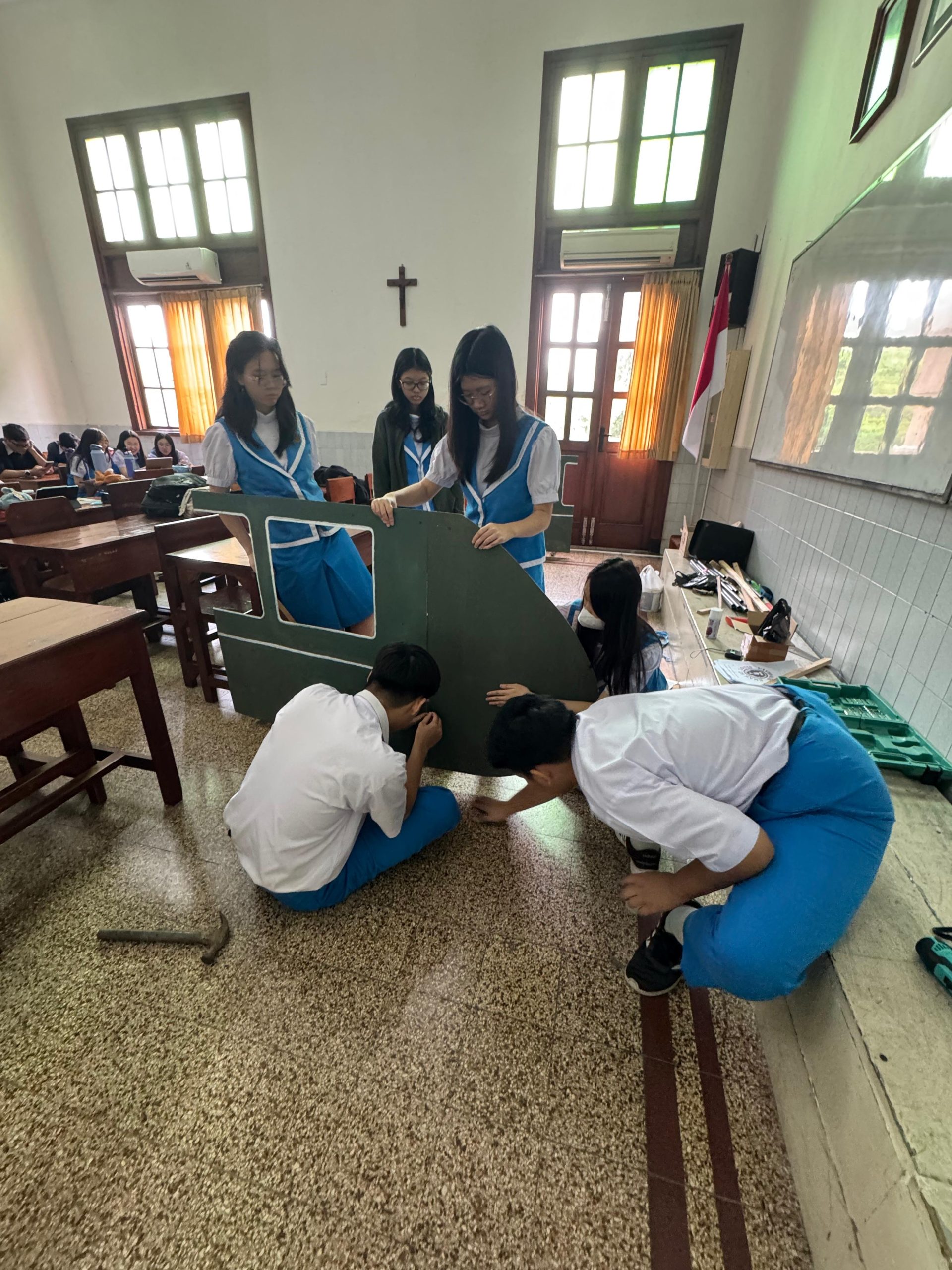 Kami kembali kerja kelompok di rumah Petri. Sie musik mulai memproduksi lagu musikal yang akan ditampilkan, tim properti juga membuat properti lain seperti mesin ketik, tongkat suku dayak, serta batu bata. Mesin ketik dibuat menggunakan kardus yang dibentuk menyerupai mesin ketik, kemudian menggunakan tutup botol yang dibuat menjadi key caps. Pembuatan mesin ketik ini memerlukan banyak tutup botol sehingga teman-teman mengumpulkan tutup botol yang tersedia. Sementara itu tongkat suku dayak dibuat menggunakan pipa dan tongkat pramuka. Teman-teman properti berkreasi untuk melukis ukiran pada tongkat masyarakat dayak sebagai referensi. Proses ini memakan waktu yang cukup lama terutama karena tongkat yang dibuat berjumlah 6 buah. Saya tidak dapat banyak membantu karena tidak cukup percaya diri untuk melukiskan ukiran. Sementara itu, anggota kelas lain pun turut membantu dalam membuat properti batu bata dengan melukis pada kardus. Hari itu pun dilakukan latihan runthrough naskah untuk para aktor sekaligus mencoba menghafalkan skrip.