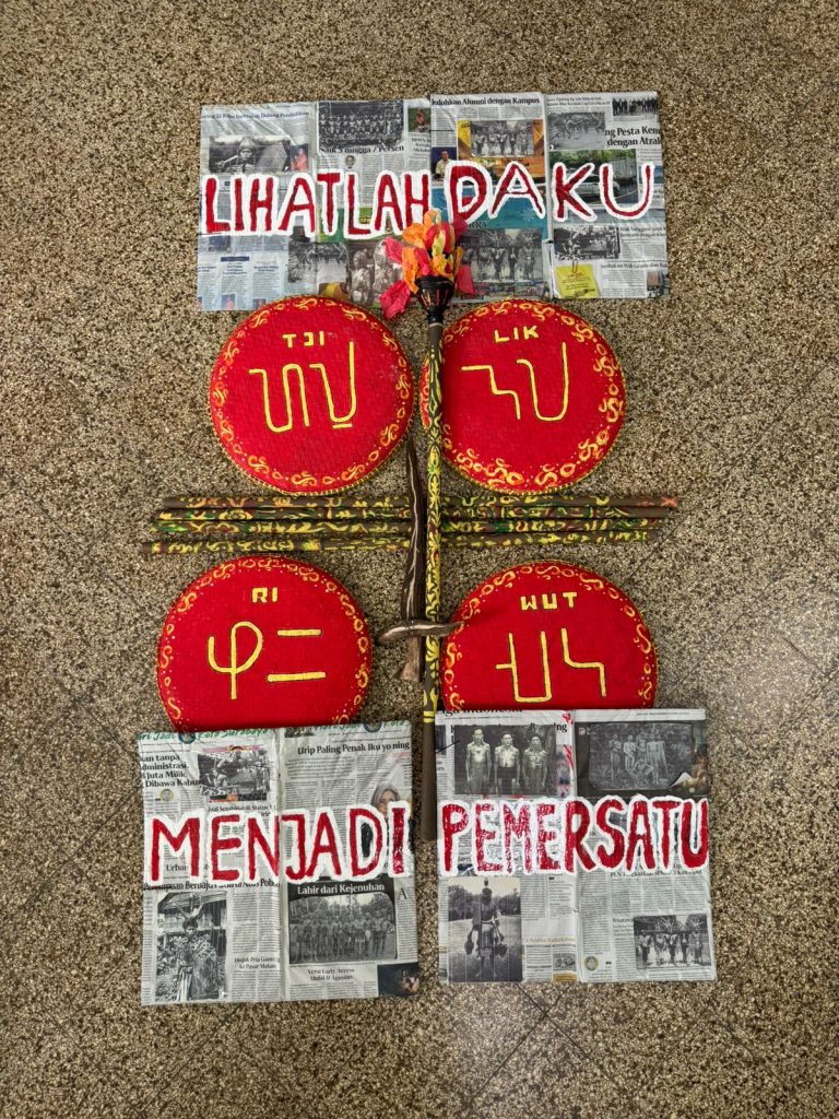 Dalam proses pembuatan sketsa, saya bertugas menggambar tjilik riwut yang berada di tengah serta membantu menggambar pulau-pulau di sisi kanan. Sketsa ini menjadi panduan penting saat proses melukis, sehingga warna dan bentuk tidak melenceng dari konsep yang telah direncanakan sebelumnya. Ketelitian sangat dibutuhkan agar hasil akhirnya rapi dan menarik.