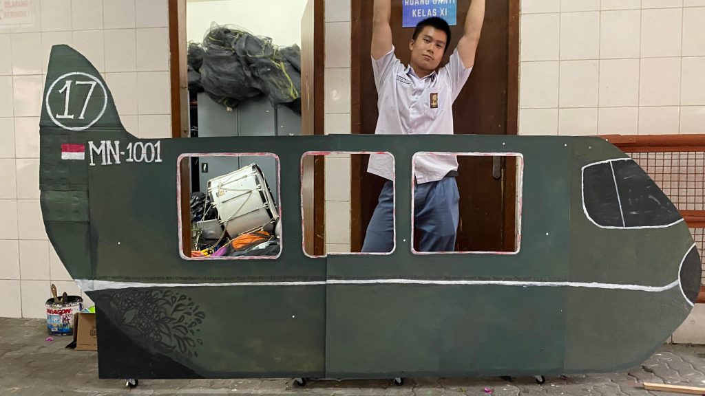 Pada 27 Januari 2026, kami menyelesaikan pengerjaan properti pesawat di sekolah sebagai tahap akhir sebelum digunakan saat gladi dan penampilan. Pada tahap ini, kami memastikan setiap bagian pesawat sudah terpasang dengan kuat dan terlihat rapi. Beberapa bagian diperkuat kembali agar tidak mudah lepas saat dipindahkan atau digunakan di atas panggung. Kami juga mengecek keseimbangan dan kemudahan saat membawa properti tersebut agar proses keluar-masuk panggung tetap lancar.