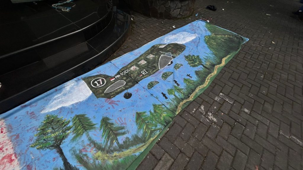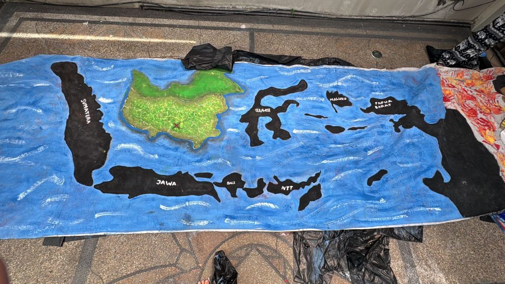 Kami mulai dengan menentukan desain dan warna yang selaras dengan konsep flashmob. Setelah itu, kain dibentangkan agar mudah dilukis, lalu kami secara bergantian mewarnai dan menambahkan detail agar tampilannya lebih hidup. Proses ini membutuhkan ketelitian dan kesabaran, terutama agar cat tidak terlalu tipis atau terlalu tebal serta cepat kering sebelum dilipat kembali.