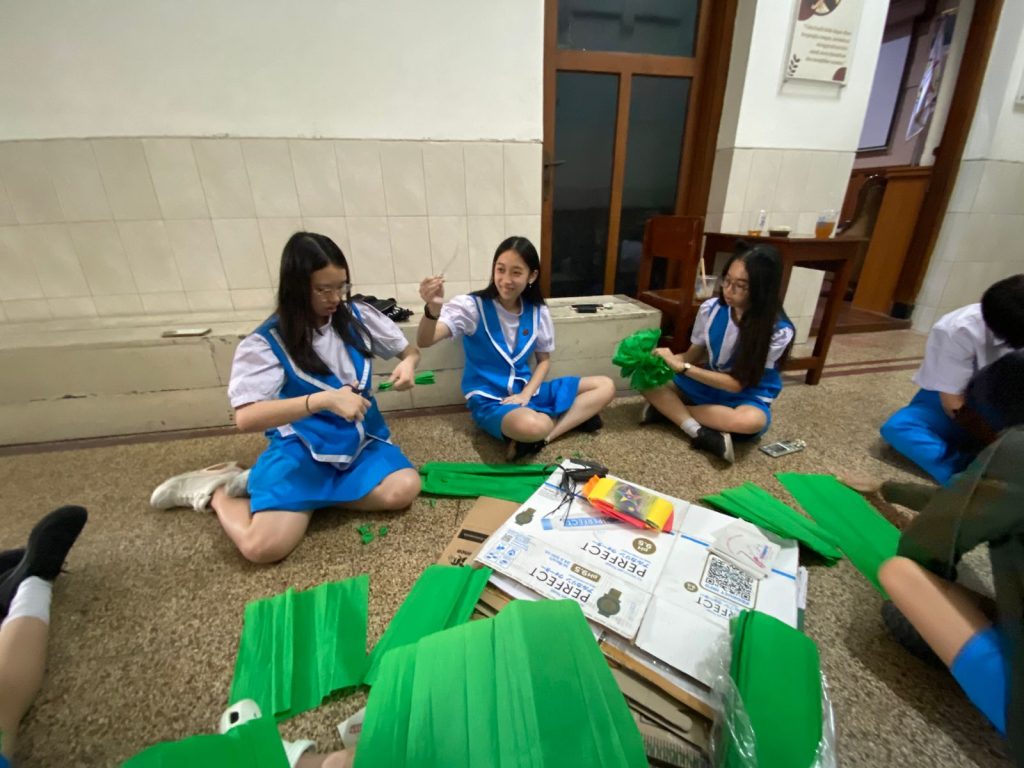 Tidak hanya itu, saya juga ikut menjahit kain yang akan digunakan untuk flashmob. Meskipun bukan hal yang mudah, saya belajar untuk sabar dan teliti dalam menjahit agar hasilnya rapi dan nyaman digunakan. Dari kegiatan hari itu, saya menyadari bahwa keberhasilan sebuah drama tidak hanya bergantung pada para pemain di atas panggung, tetapi juga pada kerja keras tim di balik layar.