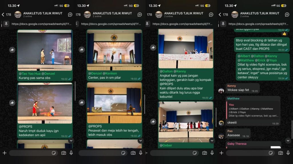 Semakin mendekati hari-H, pada akhir Januari kembali diadakan latihan dengan Sie Acara. Kelas kami selalu mengupayakan agar latihan bersama Sie Acara ini berjalan dengan selancar mungkin, memposisikan diri seolah-olah seperti sedang tampil pada hari-H. Tujuannya adalah agar kami bisa mendapatkan saran dan kritik mengenai hal-hal yang mungkin kami sebagai murid lewatkan tetapi dinotice oleh para guru, bukan saran dan kritik karena kesalahan yang kami sadari memang seharusnya tidak kami buat. Itulah mengapa kami mengupayakan latihan dengan Sie Acara harus memberi penampilan semaksimal mungkin. Untuk melakukan hal ini, selain latihan yang tekun juga diperlukan koordinasi yang baik. Sebagai wakil sutradara, tugas saya adalah mengingatkan dan memberi briefing kepada anggota kelas, tidak hanya terbatas di kelas atau saat bertemu saja tetapi juga melalui grup WA kelas.