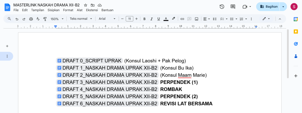 Memasuki Oktober 2025, saya dengan penulis naskah lainnya mulai menyusun draft pertama naskah yang akan dipentaskan. Awalnya, ide-ide yang terasa jelas di kepala, tetapi ketika dituangkan ke dalam tulisan, terasa sungguh berbeda. Dari satu draft, berkembang menjadi enam draft. Setelah menyelesaikan draft awal, kami mulai berkonsultasi secara bertahap dengan para guru. Konsultasi pertama yang dilakukan adalah dengan guru Bahasa Mandarin. Selanjutnya, saya berkonsultasid engan guru Bahasa Jawa untuk memastikan penggunaan bahasaya yang sesuai. Setelah itu, saya membawa naskah tersebut ke guru Bahasa Indonesia untuk ditinjau secara keseluruhan. Di tahap ini, saya diminta untuk memperpendek naskah. Awalnya, hal ini cukup sulit untuk dilaksanakan karena ada beberapa bagian yang menurut kami penting dan sayang untuk dihapus. Namun, sebuah naskah juga harus bisa efektif. Saya kemudian melakukan revisi dan memadatkan beberapa dialog tanpa menghilangkan inti cerita. Draft selanjutnya merupakan hasil konsultasi dengan guru Bahasa Inggris. Kemudian, naskah sekali lagi dibawa ke guru Bahasa Indonesia, ketika kami diminta untuk memperpendeknya sekali lagi. Di antara proses perpendekan pertama dan kedua ini, sempet terjadi perombakan struktur. Perubahan ini cukup menantng karena harus menyesuaikan ulang transisi antaralur agar tetap mengalir. Revisi terakhir dilakukan pada draft keenam saat latihan bersama dengan para pemeran. Di tahap ini, ternyata ditemukan beberapa dialog yang terlalu panjang ketika diucapkan, dan ada bagian yang kurang mengalir saat dipentaskan. Dari situ, kami bersama-sama melakukan penyesuaian akhir agar naskah lebih nyaman untuk dilaksanakan.
