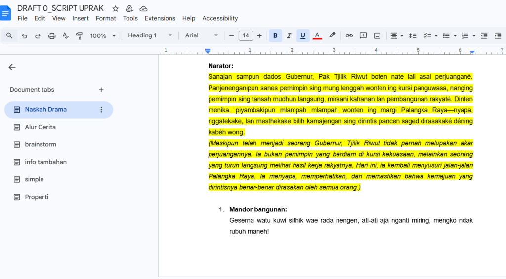 Dalam pembagian tugas penulisan, saya mendapat bagian menulis adegan upacara serta adegan yang menunjukkan perkembangan Kalimantan. Salah satu adegan tersebut menggunakan Bahasa Jawa. Proses ini cukup menantang karena saya harus menyesuaikan penggunaan bahasa dengan konteks budaya dan suasana adegan. Selain itu, kami mendapat masukan bahwa naskah yang kami susun terlalu panjang, sehingga perlu dilakukan revisi. Dari situ saya belajar untuk memilah bagian yang benar-benar esensial dan fokus pada inti cerita agar tetap efektif saat dipentaskan.