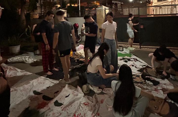 Pada tanggal 7 Februari, saya mengikuti kegiatan mengecat kain bersama kelas. Kegiatan ini dilakuakan di rumah sutradara kami, Eugene. Kami semua bekerja hingga malam hari. Bahkan, ada beberapa teman yang memutuskan untuk menginap. Pada pagi hari esoknya, saya Kembali untuk membantu menyelesaikan pengecatan kain. Seluruh kegiatan ini selesai pada hari minggu, tanggal 8 Februari pukul 2 siang. Kesulitan yang kami alami adalah kehabisan cat pada malam hari sehingga kegiatan mengecat terpaksa harus dilakukan hari esoknya.